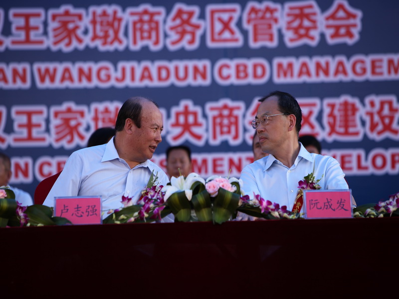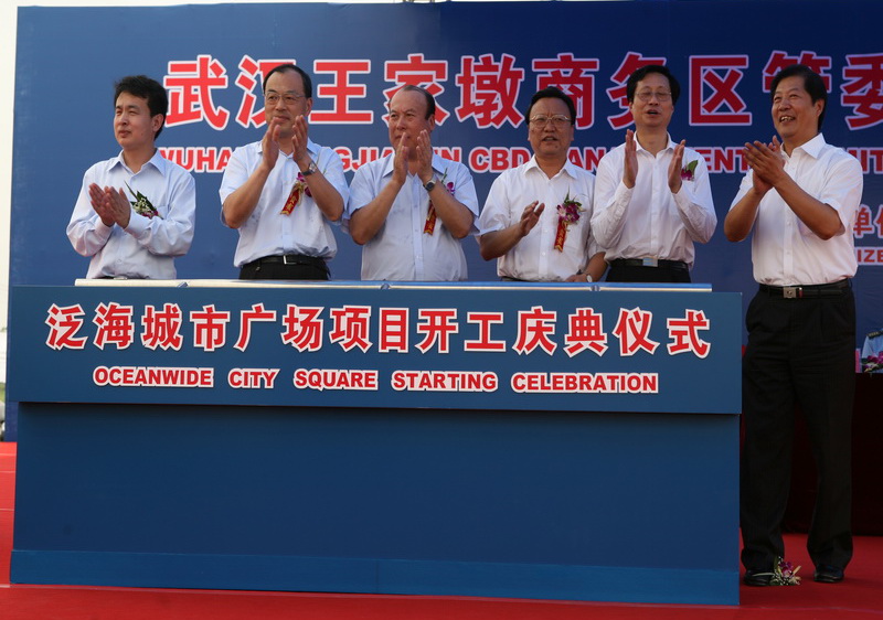 典礼仪式上,阮成发市长、涂勇副书记共同为“武汉王家墩商务区管委会”揭牌,随后,卢志强董事长,阮成发市长,涂勇副书记,省工商联主席赵晓勇,泛海建设集团副董事长李明海、武汉王家墩中央商务区建设投资股份有限公司董事长韩晓生共同推动项目开工开关,在欢快激昂的乐曲声中,打桩机同时启动,彩花飞舞、机械轰鸣,“泛海城市广场”项目正式开工建设。