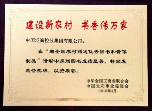 中国泛海控股集团向该项目捐赠《社会主义新农村建设现代农业实用技术丛书》、《农民工就业培训丛书》、《中华道德故事经典重现系列动画片》等总计600套图书和音像制品,用于在全国范围内捐建200家“光彩农村书屋”,以实际行动积极支持社会主义新农村文化建设。