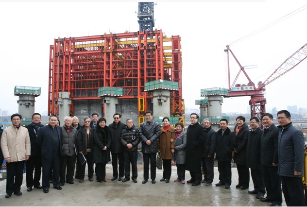 公司领导与市资深规划专家在“武汉中心”项目前合影留念
