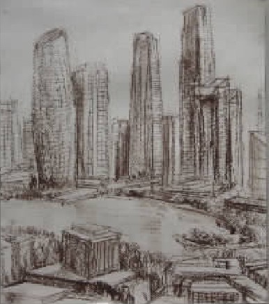 本报讯(见习记者万旭明)昨日,画家陶炽勇随“我们一起看工地”,走进王家墩商务区工地,用自己的画笔绘下了CBD的今天与明日。一进入王家墩商务区的工地大门,汉铁高中的美术教师、区学科带头人陶炽勇就饶有兴致地从车窗向外看。来到地下空间的工地现场时,俯瞰巨大的基坑,市民们都好奇地询问地下空间的层数、大小或未来的用途,陶炽勇却被地下空间的框架结构吸引住了,赶紧掏出相机从各个角度拍摄。在他的写生作品中,看似繁复的地下空间框架被画笔凝练,纹理看似横七竖八实则乱中有序,有种别样的美感。